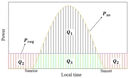Figure 5 shows a sketch map for illustration of the energy balance. As shown in the figure, is the energy generated by solar arrays which is directly used for running the airship, is the available surplus energy for storage in lithium battery when , is the energy consumption, which needs to be supplied by the lithium battery. Obviously, the total energy generated by the solar array in daytime should not be less than the required energy of the airship over one day. Therefore, the energy balance model can be described as