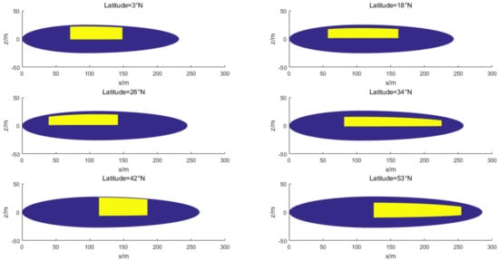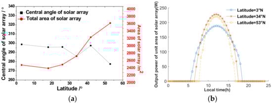 Studies indicate that the circumferential locations of the solar arrays significantly affect the electrical energy output. Lv et al. [] found that the central angle of solar array has a significant influence on output energy. However, they focused only on solar layouts for fixed airship parameters, without considering other disciplines. Lv et al. [] studied the advantages of cylindrical shaped solar array, without considering the coupling effects of the attitudes, latitudes, heading angles and dates on the optimal rotation angles of the solar array. In a recent study, Zhang et al. [] established a multidisciplinary design methodology to minimize the total mass of the airship and used central angles of the solar arrays as design variables. However, the common shortcoming of the above studies is that the calculation formulation of required storage battery capacity considered only the time discharged at night, without considering the simultaneous operation of battery and solar array when the output power of solar array is lower than required power in daytime.