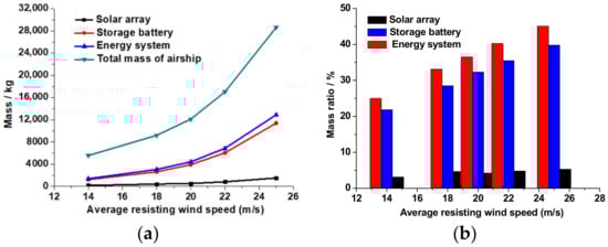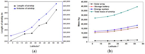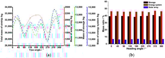With potential in military and civil applications including communication, surveillance, observation and scientific research, there is a growing interest in studying stratospheric airships in recent years [,,]. Stratospheric airships generally remain aloft at specific altitudes (18~22 km) for long endurance (several months) using buoyancy of lighter-than-air gas [,,]. To achieve the long-endurance station-keeping task, renewable energy systems are generally used, which is mainly composed of energy-generating cells, energy-storage batteries and energy management devices []. Many studies have been conducted to investigate the feasibility of stratospheric solar-powered airships [,,,,]. Generally, flexible solar arrays are placed on the surface of the airship envelope []. However, a design using solar arrays with higher area and mass might lead to a considerable decrease in the entire airship system mass, even though the mass fraction of energy system mass to total airship mass may increase. Therefore, a multidisciplinary optimization problem needs to be framed and solved [].