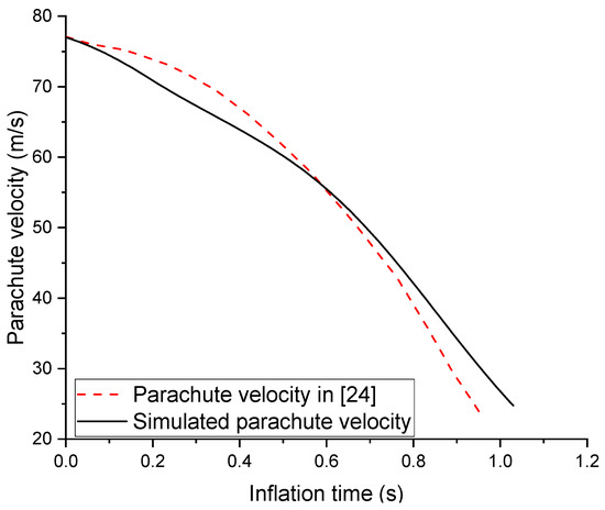 The inflation process in [23] is simulated and the transient deceleration process is compared in Figure 4. The simulated velocity matches the results well and the model successfully predicts that the deceleration is more efficient as the parachute inflates. The parachute fully inflates at a speed of 24.7 m/s numerically, compared with 22.9 m/s in the experiment, and the velocity error is 7.8%. This shows that the model is capable of predicting the transient parachute aerodynamic performance and its velocities during the inflation stage.