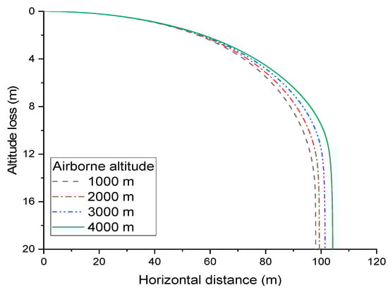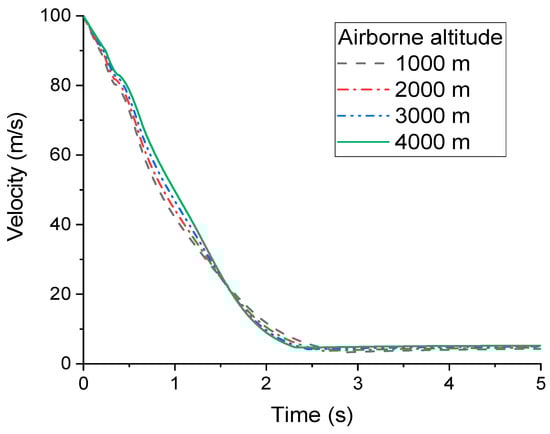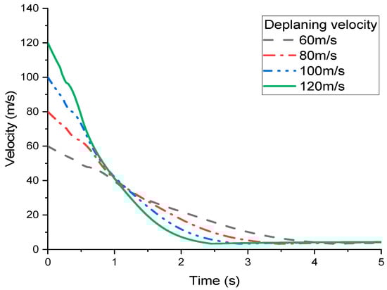 The flight velocity changes at different deplaning velocities are shown in Figure 7. With the increase in the deplaning velocities, the deceleration effect of the parachute is more significant as the drag increases with the square of velocities. The velocity difference between parachute systems decreases before the parachute inflates. As the parachute fully inflates, the order of parachute velocities reverses after ~1.0 s. This is because both deployment time and inflation time decrease due to the larger inertia. Compared with the system deplaning at 60 m/s, the deployment time and inflation time of the system deplaning at 120 m/s reduce by 53.3% and 42.7%, respectively. Therefore, the larger the deplaning velocities are, the earlier the parachute systems reach a steady state. The flight trajectories at different deplaning velocities are shown in Figure 8. The increase in the deplaning velocity directly increases the horizontal distance of the motion, e.g., the parachute systems deplaning at 120 m/s travel 15.9% 6further. Furthermore, the altitude loss during the parachute inflation reduces, as the parachute inflation time reduces. This explains the sharp “brake” at 120 m/s in the flight trajectories in Figure 8.