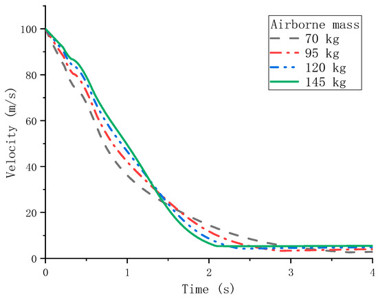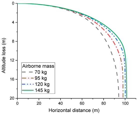 In the civil rescue event, it is common that different parachute airborne systems are equipped with different devices; therefore, the mass varies. The flight velocities of parachute systems with different masses are compared in Figure 9. The larger mass increases the inertia of the parachute systems and delays the deceleration process while the drag is independent of the mass. As a result, the velocity of the system with a larger mass is greater before the parachute inflates. However, the larger velocity reduces the inflation time as the inflation distance is constant and the parachute reaches a steady descent earlier. Compared with the system deplaning at 60 m/s, the deployment time and inflation time of the system deplaning at 120 m/s reduce by 53.3% and 42.7%, respectively. This results in the similar reversed velocity trend in Figure 9 as observed in Figure 7. It should be noted that the steady velocity is slightly higher for systems with a larger mass. The flight trajectories of the parachute systems with different masses are shown in Figure 10 and the results show that heavier parachute systems can travel 8.0% further in the horizontal direction. The effect of increasing the airborne mass is similar to increasing the deplaning velocity because both of them increase the inertia effect. However, the trajectories before inflation resemble each other as the minor velocity difference during deployment has a negligible effect on the aerodynamic drags.