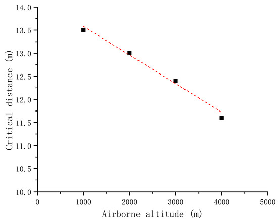 The critical distances between the parachute systems are calculated based on the trajectories of the airborne clusters. Figure 12 shows the critical distances at different airborne altitudes. As the airborne altitude increases, the decreased air density leads to smaller aerodynamic drags. The inertia effect dominates over the aerodynamic force and the parachute tends to maintain its motion. As a result, with the decrease in the airborne altitude, the critical distance between the parachute systems increases almost linearly. It should be noted that although the altitude reduces by three-quarters, the critical distance only increases by 16.4%, and is still in the risk region. However, deplaning at lower altitudes benefits a precise landing in condensed airborne clusters. Therefore, it may be favorable to choose the smallest airborne altitude possible.