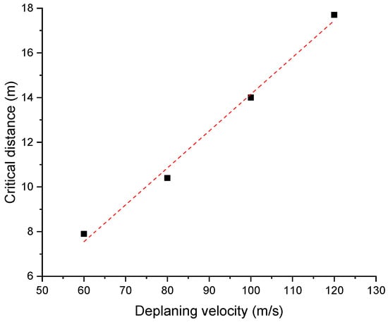 The critical distances between parachute systems at different deplaning velocities are shown in Figure 13. The increase in the deplaning velocity increases the aerodynamic force dramatically and the aerodynamic deceleration dominates the inertia effect. Therefore, the parachutes decelerate more efficiently and the critical distance increases almost linearly with the deplaning velocities. In Figure 13, once the deplaning velocity is greater than 100 m/s, the airborne clusters are likely to be safe from parachute interactions. However, the larger deplaning velocity promotes the scattering of the landing location and should be selected based on the maneuverability of the parachutes.
