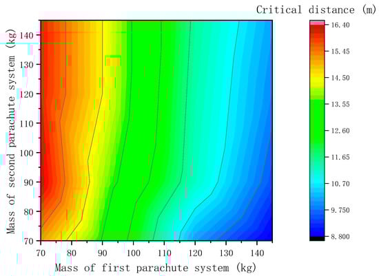 As discussed in Section 3.3, the flight trajectories of parachute systems vary with the airborne mass. Therefore, it is reasonable that a good arrangement of the airborne order by mass can reduce the possibility of parachute interactions. The critical distances with different airborne mass arrangements are shown in Figure 14. The increase in the airborne mass promotes the inertia effect; thus, the parachute system tends to maintain its motion. The motion of the first parachute system reduces the critical distance while that of the second parachute system increases the distance. Therefore, the critical distance decreases with the mass of the first parachute systems but increases with the mass of the second parachute systems. At the critical moment (t2 moment in Figure 11), the first parachute system is at the inflation stage and the second parachute system is still at the deployment stage where the aerodynamic force is much smaller than the gravity. This explains why the critical distance is relatively insensitive to the mass of the second parachute system. In real scenarios, it would be beneficial to arrange the airborne order by mass, e.g., postponing the heavy parachute systems. Furthermore, adopting adaptive time periods based on the mass of the last parachute system can also help. Longer airborne intervals after the heavy airborne systems lead to larger critical distances and hence help to avoid parachute interactions.