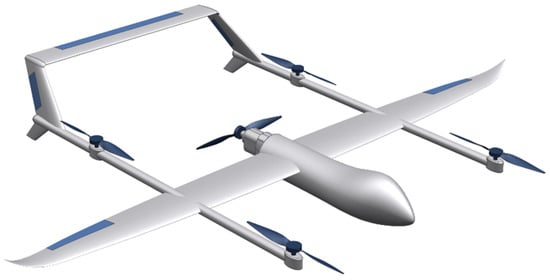 There are several possibilities for hybridization of UAVs. While the authors in [] described a hybridization within the propulsion system, the hybridization of UAVs considered in this work refers to the possibility of flying in energy-efficient fixed-wing mode with a pusher motor or flying in quadcopter mode to enable vertical takeoff and landing (VTOL). At the Institute of Flight Systems and Automatic Control, such a UAV has been developed as part of the ACoRUs project [], which can be seen in Figure 1.