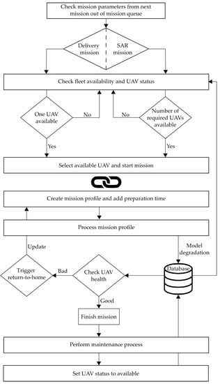 Due to their various configurations and characteristics, unmanned aerial vehicles (UAVs) show a high potential for civil [] and military use cases []. In addition, they gain more operational possibilities when they are operated in a cooperative way or in swarm-like constellations, so a swarm of UAVs exceeds the mission capabilities of more traditional aircraft or helicopters in terms of quality, cost, and time. The comparatively low costs and the projected increase in the number of UAVs in use [] emphasize this statement. However, superordinate missions can only be achieved by having a highly reliable system. In the case of a UAV swarm, the term “system” is no longer sufficient. Rather, a system of systems (SoS) describes a constellation in which every individual UAV is responsible for a part of the superordinate mission. Reliability is achieved through operational stability and the awareness of the system status of every individual asset of the SoS. Furthermore, observing the system states in real-time with the help of prognostics and health management (PHM) methods enables the compensation of contingencies and enforces reliability within the SoS. The goal of this paper is to present a framework for health-oriented UAV fleet operations that incorporate PHM methods to enable decision making. The manipulation of a fleet’s behavior increases reliability within superordinate UAV swarm missions. To support the development of intelligent maintenance strategies, the developed software was released under an open-source license [].