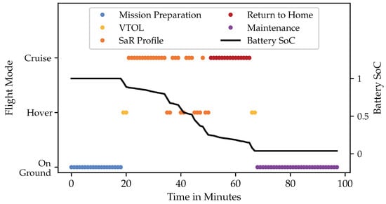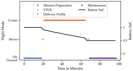- Mission execution: Execution of the generated mission profile beginning and ending with a VTOL phase. Due to the high fixed-wing portion of delivery missions, the energy consumption is not that high and the battery capacity will always provide enough energy for the mission. Due to the hover portion of SaR missions and the randomness of energy consumption, as well as the effects of degradation on energy consumption, battery capacity can be critical for SaR missions. To ensure safe operation, the mission is aborted at a certain capacity threshold so that the UAV can still fly to the next base with sufficient battery capacity to perform a safe landing. Neglecting exact distances, the return-to-home process is modeled rather generically.