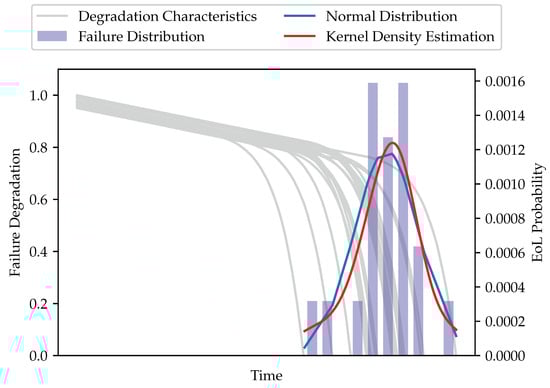 The integrated bar chart shows the distribution of failures, the blue curve shows the normal distribution of failures, the red curve shows the Kernel Density Estimate of failures. While the normal distribution is based on statistical values drawn from the data, the kernel density estimation is fitted to the actual data. It is beneficial to see that both slopes have the same characteristics, which is a validation of the realistic distribution of the failures. A closer look at the degradation process reveals a linear trend at first (wear phenomena), which is continued from a point in time (fault occurrence) with an exponential course. Other failure types show the same characteristics. The difference is the timing of the failure occurrence. Again, it is assumed that the pusher motor is more robust, so the mean value for the occurrence of failure is higher compared to the occurrence of failures of the hover motor. A bearing failure is assumed to occur more frequently than a winding short—therefore, the time of occurrence of bearing failure is much shorter than that of a winding short. The combination of different failure characteristics creates a complex degradation process for the higher-level system, the UAV itself.