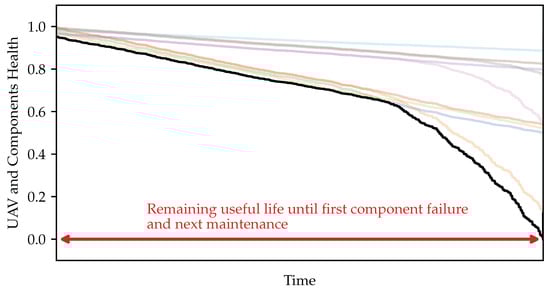 The diagram shows the degradation of the UAV over time. To avoid confusion between simulation time and actual time, the exact indication of the time unit on the x-axis has been removed. Black represents the system state derived from the most degraded component. The colored curves represent the individual state of the components. As mentioned earlier, the degradation characteristics of the different subsystems differ from each other. There are components with more constant degradation and components where failure occurs more suddenly. The combination of the different degradation characteristics of the components leads to unique RUL time intervals. Different maintenance strategies can be used to manipulate the time intervals between maintenance events. This paper mainly focuses on a predetermined and a condition-based maintenance (CBM) strategy. The results and differences are described in Section 3 and Section 4.