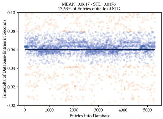 - The system operates in more of a soft real-time environment, as the database entries do not strictly adhere to the specified timing (see Figure 6). The deviation from the given time constraint is small and does not affect the functionality of the simulation. The figure shows that almost every entry in the database is slightly delayed (blue dots) compared to the given time condition. Nevertheless, there are database entries that have a larger deviation from the default time condition. These entries are not within the standard deviation from the given time constraint for the simulation (orange dots) and account for just under 14 percent of the entries in terms of volume, which is negligible compared to the given functionality of the simulation.