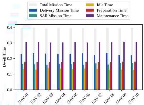 Using the given metrics (1) and (2), the experiments were evaluated with a predetermined maintenance strategy as well as with a condition-based maintenance strategy. Missions from the mission queue were evenly distributed across the fleet so that mission dwell times were nearly equal across all UAVs. Figure 8 shows the dwell times of each UAV within the fleet for each mission phase for an experiment with a predetermined maintenance strategy.