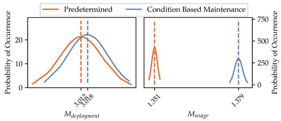 For , the mean values of the predetermined and the CBM strategy are quite close to each other. The distribution of the values of the predetermined maintenance strategy is almost the same compared to the distribution of the CBM strategy. The small difference in the mean values can be explained by the similar deployment strategy of the UAVs. Improvements could be achieved by changing the deployment strategy, e.g., by integrating unused UAVs. More UAVs could be used for a SaR mission if the next missions cannot be launched due to a lack of available UAV. This would result in a faster mission execution and higher utilization of available UAVs. However, it is questionable whether there will always be outstanding missions in reality. More UAVs deployed for a SaR mission means faster mission completion on the one hand, but higher costs on the other. Cost is not directly accounted for in this metric. The distributions of  can be better distinguished from each other. The dispersion looks very similar again, but the mean values of the distributions are clearly separated between the two maintenance strategies. This suggests that the enhanced maintenance strategies using PHM methods are having their desired effect. Checking the UAV status before deployment, deploying for the most appropriate mission, and initiating maintenance actions depending on the condition of the components lead to less degradation and maintenance actions. This would also reduce the cost in an indirect way, which again cannot be directly captured by this metric.