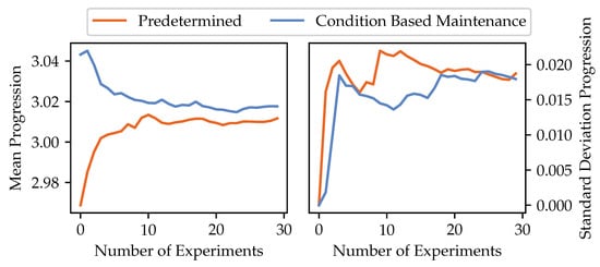 Due to the randomization of the initialization and the degradation processes within the simulation, the execution of multiple simulation runs produces results that are also subject to a certain degree of randomness. These simulations are also referred to as Monte Carlo simulations []. To prove that the simulation produces robust results, the means and standard deviations (STD) for the metrics that evaluate the Monte Carlo simulation are investigated over the number of experiments. The progression of the statistical values can be seen in Figure 10 and Figure 11.