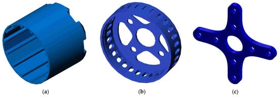 The design of the BLDC motor components from the previous study [] was optimized for a more appropriate additive manufacturing process. Thus, for easier manufacturing, the rotor and the right housing were designed as one piece (Figure 1a), to remove the need for assembly. This component (Figure 1a) has been provided with spacer surfaces for easy positioning of the magnets. The other two designed components of the BLDC motor were the left housing (Figure 1b) and the motor mount (Figure 1c). The rotor has a wall thickness of 2 mm, a length of 55 mm and an outer diameter of 49.8 mm. The left case (Figure 1b) has a diameter of 49.8 mm, a shell thickness of 2 mm and is provided with holes for ventilation. The motor mount component (Figure 1c) has four arms and a thickness of 4 mm.