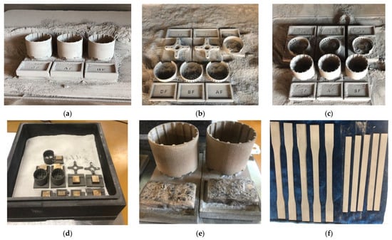 Additive manufacturing of BLDC motor components using the SLS process: (a) Parts cleaning; (b) left housing and motor mount; (c) rotor; (d) preparing the components for infiltration into the sintering furnace; (e) rotor obtained after infiltration; (f) specimens obtained after infiltration.