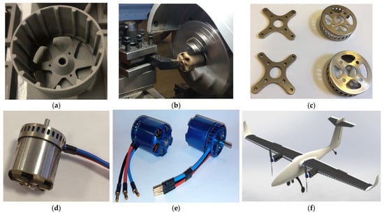 On the left cover of the stator, in the four threaded holes, the motor mount (Figure 4c) is secured by screws, which allows the positioning of the electric motor on the aircraft structure. Once the electric motor was assembled (Figure 4d) the painting preparation followed. The outcome of all these steps was an electric motor with components manufactured using the SLS process (Figure 4e). The BLDC motor will be the propulsion system of a twin-motor airplane, from composite materials and composite sandwich structures [], through the FFF process (Figure 4f). Table 4 shows the main characteristics of the assembled BLDC motor.