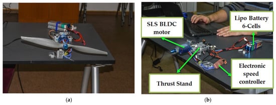 This test stand has the following characteristics: thrust: 5 kgf, torque: 2 Nm, voltage: 50 V, current: 55 A. In order to test the electric motor, we first need to calibrate the RCbenchmark Series 1585 experimental stand. Afterwards, the electric motor is fixed on the stand and first tested without the propeller. When the propeller is mounted, the motor is tested again, but first at low speeds (Figure 5a), and then the speed is increased. The following equipment was used to test the motor: RCbenchmark Series 1585 traction test stand, an ESC (Electronic Speed Controller) carrying a current of 60 A, 2 LiPo batteries with three cells connected in series (Figure 5b), a computer, a RCbenchmark GUI 1.2.0 software system and a 16 × 8-inch propeller.