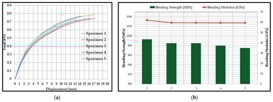 The results of three-point bending tests: (a) load–displacement curves of the specimens; (b) bending strength and bending modulus of specimens.