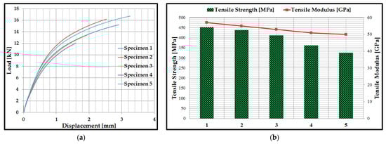 The results of tensile tests: (a) load–displacement curves of the specimens; (b) Tensile strength and tensile modulus of specimens.