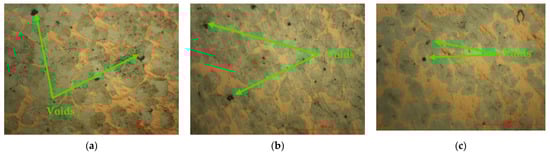 The microscopic analysis of the specimens was carried out after the three sections established in Section 2.4. From the microscopic analysis of the three sections of the specimens, it can be seen that the specific process of obtaining metal parts with the help of the SLS process proceeded in good conditions, highlighting minor defects such as voids [,,] of small sizes. The capillary infiltration process took place according to the technical conditions of the material and equipment used and at the optimal temperature, as proven by the micrographs analyzed (Figure 8), as well as the results obtained during the three-point bending and tensile testing of the specimens manufactured via the SLS process using A6 steel.