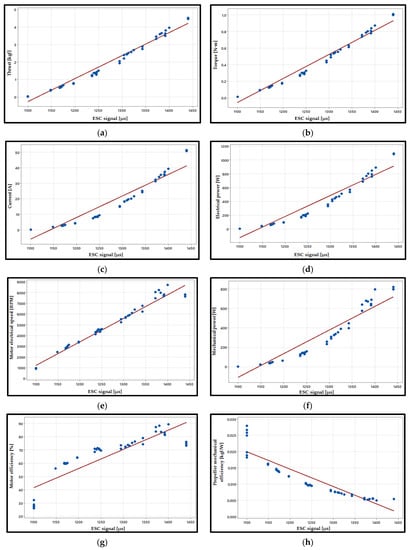 BLDC motor test results: (a) Dependence between thrust and ESC signal; (b) dependence between torque and ESC signal; (c) dependence between current and ESC signal; (d) dependence between electrical power and ESC signal; (e) dependence between motor electrical speed and ESC signal; (f) dependence between motor mechanical power and ESC signal; (g) dependence between motor efficiency and ESC signal; (h) dependence between propeller mechanical efficiency and ESC signal.