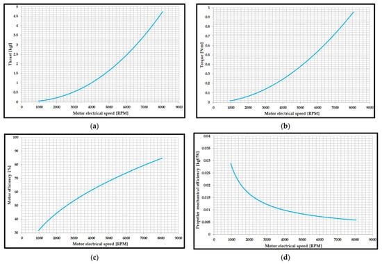 The performances of the BLDC motor manufactured via the SLS process: (a) thrust variation according to motor electrical speed; (b) variation of torque according to motor electrical speed; (c) motor efficiency variation according to motor electrical speed; (d) variation of propeller mechanical efficiency according to motor electrical speed.