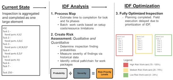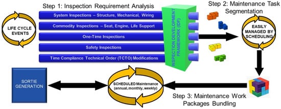 The IDF Model shown in Figure 2 reflects the USAF’s desire to mirror commercial best practice in maintenance scheduling. Specially, IDF seeks to support maintenance schedulers and technicians in synchronizing maintenance packages with the operational mission’s demand signal in mind by optimizing the scheduling of inspections during maintenance opportunities to allow for better utilization of aircraft readiness [18]. At its core, IDF identifies and divides inspections into smaller, more frequent inspections for better scheduling and utilization of maintenance opportunities. The process that IDF follows to accomplish this objective (as shown in Figure 2) includes the following steps: