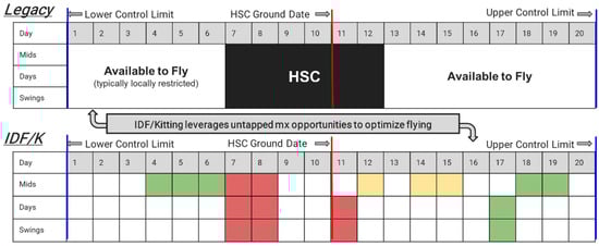 The resulting experimental HSCs were significantly different than traditional C-5M HSCs, as shown in the bottom and top of Figure 5 respectively. While a traditional C-5M HSC would complete maintenance within a 20-day window determined by the due date (red line) plus or minus 10 days (blue lines indicating upper/lower control limits), experimental HSCs placed newly built maintenance packages, risk rated by color, onto the calendar within the 20-day window. The aircraft was then coordinated with the Production Supervisor and HSC Crew Chief for the timing of the flying versus maintenance inspection by shift (i.e., mid versus day versus swing shift).