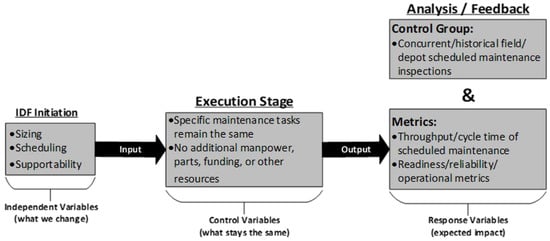 A series of experiments, shown in Figure 6, was designed for the IDF pathfinder to identify, control, and measure the variables involved between the treatment and control groups. The hypothesis tests completed in the pathfinder attempted to confirm the notion that the commercial best practice of right-sizing maintenance tasks using the IDF approach would increase utilization rates. Specifically, the team proposed to segment and decompose the C-5′s HSC as a means to more closely replicate commercial airline maintenance operations and achieve better performance for the C-5 fleet. Independent variables changed in the pathfinder would include the sizing, scheduling, and supportability of maintenance packages using IDF (i.e., number of maintenance tasks planned for one period/package, when they are planned to be performed, and resource availability to complete the maintenance). During the pathfinder’s Execution Stage, control variables held constant include the specific maintenance tasks listed in the C-5 work cards comprising the work packages. During the Analysis/Feedback phase, response variables measured in the experimental group include performance metrics related to the velocity of the scheduled maintenance tasks and other readiness, reliability, and operational metrics. These variables are compared to the control group involving concurrent and historical scheduled maintenance inspections in the field.