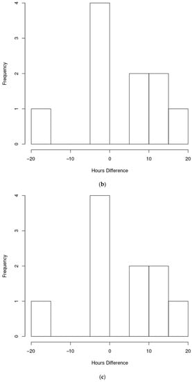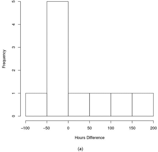 - TNMCMS hours: As portrayed in Figure 8a, the average increase in TNMCMS time was 21.8 h with a corresponding confidence interval of (−33.9, 77.5). With nine degrees of freedom, this test yielded a test statistic of −0.88602 with a corresponding p-value of 0.3987. At a significance level of 0.05, we failed to reject the null hypothesis that the mean of the control TNMCMS hours is equal to the experimental TNMCMS hours. Thus, there is not enough statistical evidence to conclude that the difference in means is different from zero.