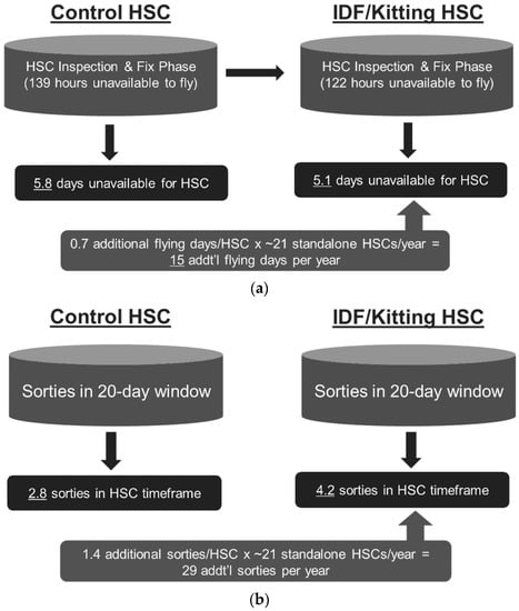 While implementation varied by base, both bases gained benefits from using the experimental IDF process. Dover AFB, on average, completed their IDF/kitting HSC scheduled maintenance 17.0 h faster than their legacy HSC with a 95% confidence interval of (−48.2, 88.2). Thus, assuming there is approximately 21 HSCs performed each year at Dover AFB, they would receive a total of 14.9 additional days of MC time as shown in Figure 9a. Similarly, Travis AFB, on average, received an additional 1.4 sorties within their 20-day window with a 95% confidence interval of (−1.3, 4.1). Hence, assuming approximately 21 HSCs performed each year at Travis AFB, within the 20-day window from the start of the HSC, they would receive an extra 29.4 sorties as shown in Figure 9b. The extrapolation to the 95% confidence interval would indicate that we are 95% confident that the true mean would provide between −27.3 and 86.1 additional sorties in the 20-day window for the base.