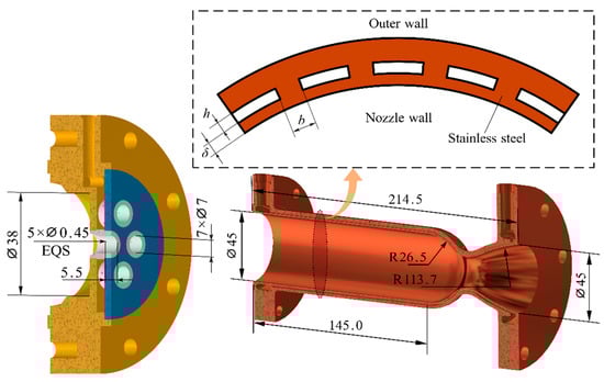 The regenerative cooling channels were of milled-slot construction, taking the design of constant rib width. The rib width of the cooling channels was 2 mm; the inner wall thickness of the engine as well as the height of the cooling channels were 1 mm. The number of cooling channels was 18, and the outer wall thickness was 2 mm. Considering the compatibility of hydrogen peroxide and materials, the cooling channel materials were 1Cr18Ni9Ti stainless steel, while copper could not be used.