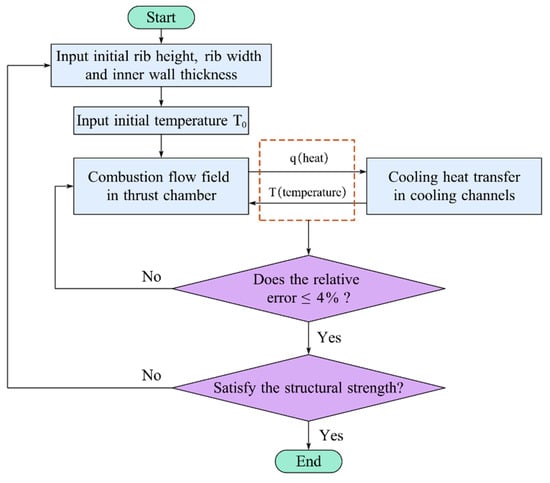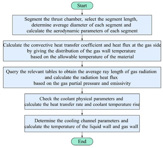 In order to verify the rationality of the regenerative cooling channel design, one-dimensional preliminary calculations for regenerative cooling were required. The steps of the preliminary regenerative cooling calculation are shown in Figure 3. The preliminary calculation was based on a one-dimensional thrust chamber, the results of which can quickly determine whether the design of the regenerative cooling channels is reasonable. The one-dimensional preliminary calculation provided the basis for the subsequent detailed simulation in three dimensions.
