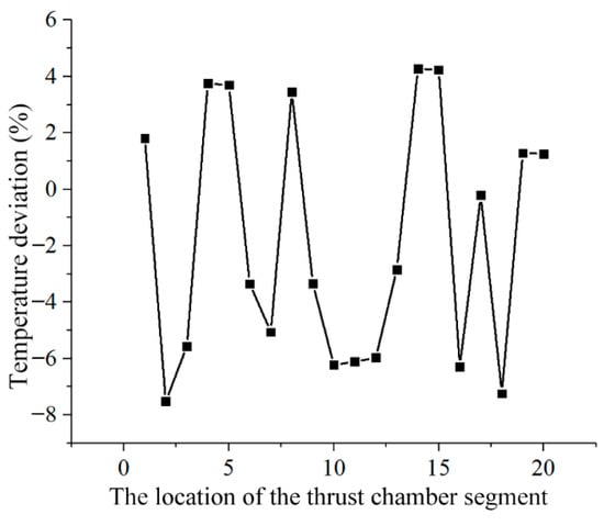 In this study, the flow rate of hydrogen peroxide was 353 g/s, and the mixing ratio of hydrogen peroxide and kerosene was 7.5. The simulation was carried out for the flow field inside the combustion chamber with the rated operating conditions of rib height, rib width, and the inner wall thickness. Figure 10a,b shows the contours of pressure distribution and temperature distribution, respectively. The pressure distribution and temperature distribution were clearly stable. The pressure decreased gradually from the injector to the nozzle, and the combustion chamber pressure was about 2 MPa. The thrust chamber had a low-temperature zone near the injector, and the gas reached its maximum temperature in the combustion chamber. The distribution of pressure and temperature was in accordance with the general law of rocket engines. The pressure and temperature of the combustion chamber were consistent with the design value and the theoretical value, which indicated that the calculation of the combustion was reasonable.