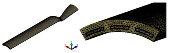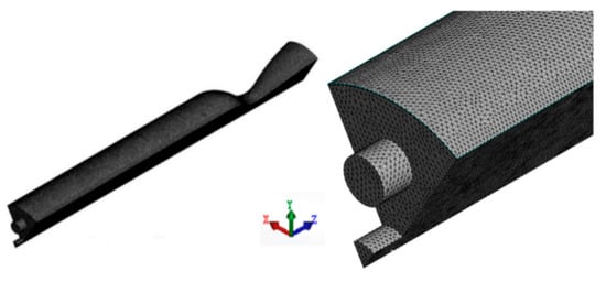 Since the fluid–solid interface must exchange data frequently during the iterative computation, a local mesh densification was performed for the fluid–solid interface in order to improve the accuracy. At the same time, the meshes of the two regions needed to be generated integrally to ensure that the nodes at the intersection of the two computational domains corresponded to each other for data transfer between them. The specific mesh regions of combustion flow field and regenerative cooling channel are shown in Figure 6 and Figure 7.