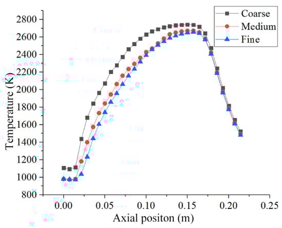 The combustion chamber pressure was 2.0 MPa, the flow rate of hydrogen peroxide was 353 g/s, and the mixing ratio of hydrogen peroxide and kerosene was 7.5. Keeping the model settings, initial conditions, and boundary conditions consistent, the combustion flow field simulations were carried out for the above three meshes, and the calculation results were analyzed. After convergence of the algorithm, the temperature on the engine axis was extracted, and the specific values are shown in Figure 8. It can be seen that the temperature curves obtained from the three meshes had the same trend. However, the difference between the results of the coarse mesh and the other two meshes was relatively large, while the results of the fine mesh and the medium mesh were very close. Taken together, the global size of the coarse mesh was larger and the calculation accuracy was lower, while the fine and medium meshes had less influence on the calculation accuracy. In order to improve the computational efficiency, the medium mesh was selected for the regenerative cooling problem of the hydrogen peroxide and kerosene engine.