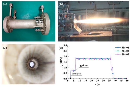 Catalysis and ignition experiments of the hydrogen peroxide and kerosene engine with regeneration cooling. (a) The hydrogen peroxide and kerosene engine; (b) the ignition of hydrogen peroxide and kerosene; (c) the inner wall of the thrust chamber after ignition from the nozzle outlet towards the injector; (d) the combustion chamber pressure under different experiment conditions.