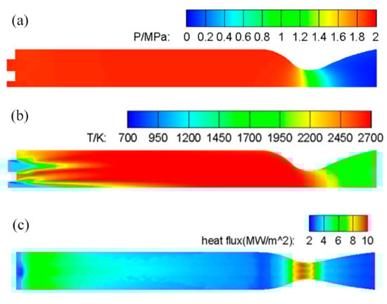 Contours of pressure, temperature, and heat flux. (a) Contour of pressure distribution inside the thrust chamber; (b) contour of temperature distribution inside the thrust chamber; (c) contour of heat flux distribution near the wall surface.