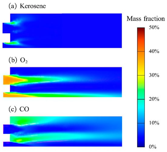 Contours of the component mass fraction. (a) Contour of the kerosene inside the combustion chamber; (b) contour of the O2 inside the combustion chamber; (c) contour of the CO inside the combustion chamber.