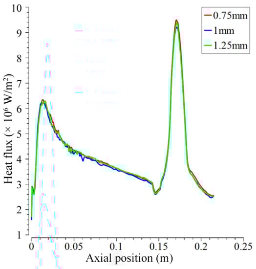 As with changing the rib height and rib width, the pressure, temperature, and heat flux distribution patterns and the magnitude of the values remained basically consistent when changing the inner wall thickness, so they are not repeated. Hydrogen peroxide, which was used as a regenerative coolant, absorbed the heat and warmed up into the catalytic bed. Its energy rose, resulting in a small increase in the temperature of the decomposed gas mixture. The difference in the average coolant outlet temperature led to a slight difference in the injection temperature, and this slight effect was reflected in the heat flux distribution. However, on the whole, changing the inner wall thickness of the regenerative cooling channel had a very small effect on the distribution of the engine combustion flow field, which was negligible for the combustion flow field.