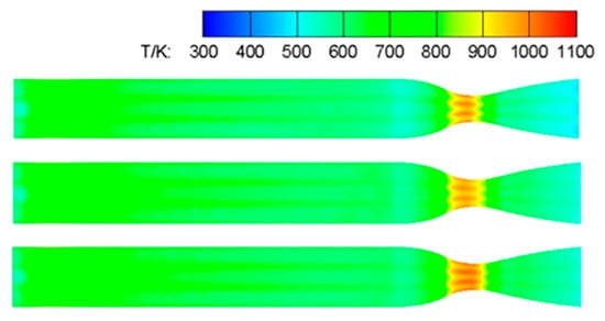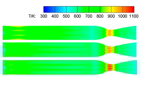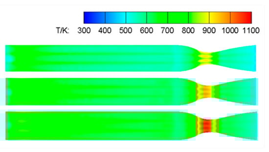 Figure 23 shows the temperature contour of the inner wall under different inner wall thickness conditions. The change in the inner wall thickness had a significant effect on the temperature field of the inner wall. First of all, the thermal environment of the high-temperature zone in the throat was significantly improved in the thin wall case. Not only was the area of the high-temperature zone significantly reduced, but the overall temperature also had a certain degree of decline.