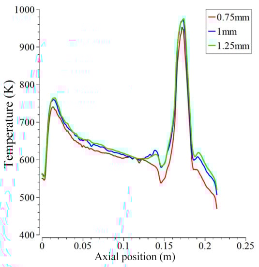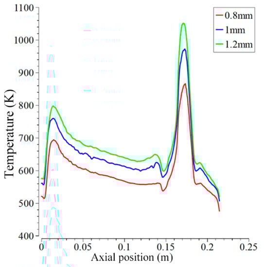 In order to observe more intuitively the distribution of the inner wall temperature under different inner wall thickness conditions, the temperature of the symmetric section through the injector was extracted and plotted in Figure 24. Although the inner wall thickness was different, the temperature trend of the inner wall remained highly consistent. There was only a certain difference in values, with an overall temperature difference of about 50 K. Compared with the 1.0 and 1.2 mm working conditions, the temperature drop of the 0.8 mm working condition was greater and more obvious.
