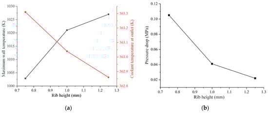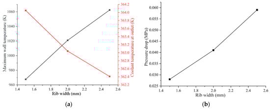Temperature and pressure drop at different rib widths. (a) Wall temperature and coolant temperature; (b) pressure drop at different rib heights.