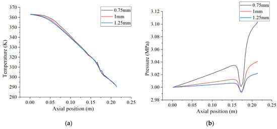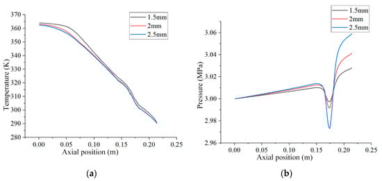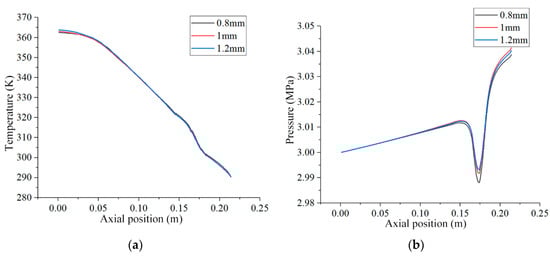 Temperature and pressure along the coolant with different inner wall thicknesses. (a) Temperature along the course of coolant; (b) pressure along the course of coolant.