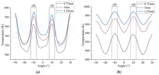 The temperatures of the inner wall near the head position (Z = 20 mm) and throat position (Z = 175 mm) were extracted and plotted, as shown in Figure 22, to study the effect of rib width on the circumferential inhomogeneity of the temperature. Unlike other operating conditions, the extreme value at the ±10° position was much smaller than the extreme value at the ±30° position for the 1.5 mm rib width, and the local inhomogeneity was reduced. When the rib width was reduced, the flow area of the coolant increased resulting in sufficient heat absorption. Together with the effect of the injector, different peaks might appear. By increasing the rib width, the temperature circumferential inhomogeneity at the head position and that at the throat position showed different change patterns. The circumferential inhomogeneity of temperature at the head position was lowest for the 2 mm rib width and highest for the rib width of 1.5 mm, which did not show linear correlation. In contrast, the circumferential inhomogeneity of temperature in the throat position increased with the rib width.