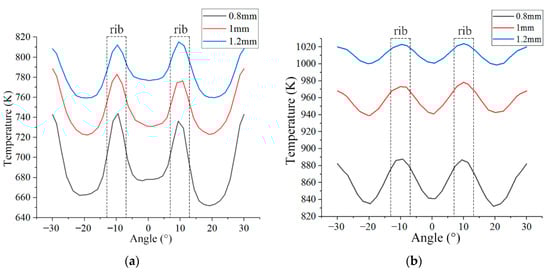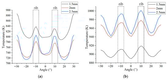 The temperatures of the inner wall near the head position (Z = 20 mm) and throat position (Z = 175 mm) were extracted and plotted as shown in Figure 27 to study the effect of inner wall thickness on the circumferential inhomogeneity of the temperature. In summary, the increase in the inner wall thickness significantly weakened the circumferential inhomogeneity of the wall temperature. The circumferential inhomogeneity of the wall temperature was more sensitive to the inner wall thickness, and the magnitude of change was more obvious compared with the rib height and rib width.