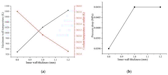 Figure 25 shows the wall temperature maxima and the average coolant outlet temperature profiles for different inner wall thickness states. Collectively, an increase in the inner wall thickness resulted in a significant increase in the maximum wall temperature and a small decrease in the average coolant outlet temperature. Overall, it was not favorable for engine thermal protection. The heat transfer of the inner wall was approximated as a one-dimensional steady-state heat conduction problem. An increase in the thickness of the inner wall increased the heat transfer thermal resistance, and the wall temperature then rose. Especially for 1Cr18Ni9Ti stainless steel, a material with relatively poor thermal conductivity, the change in the inner wall thickness had a more significant effect on the wall temperature.