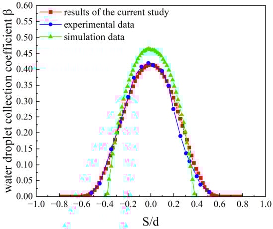 To verify the accuracy of the calculation, we compared our simulation results with experimental and simulation data [32,33] in the cylinder model, as shown in Figure 1. The data show that the maximum collection coefficient is at the front of the windward surface of the cylinder, and it gradually decreases along the direction of inflow velocity. S is the arc length from the most upstream point to a position along the surface of the cylinder, and d is the diameter of cylinder. The reason for the difference between the simulated data and experimental data is that all droplet diameters were not the same in the experiment, and the single diameter hypothesis in the simulation was not satisfied. However, the droplet conforms to certain statistical rules. In this study, the Langmuir-D distribution [33] was used to correct the simulation results. After comparison of the droplet collection coefficient along the cylinder, our calculation results were shown to be in good agreement with the experimental data, and the mean deviation was less than 6.9%.