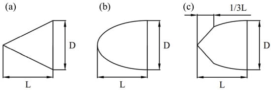The three most commonly used shapes of an aero-engine spinner, including conical, elliptical, and coniptical shapes [19], were investigated in the study, as shown in Figure 2. Each kind of spinner has the same bottom diameter (D), which is 0.5 m, and three different lengths (L). The length of the conical part of the coniptical-shaped spinner is 1/3 L. As listed in Table 1, D/L = 1, 1.2 and 1.67. The range of D/L is determined with reference to the experimental data range of Hu et al. [18].